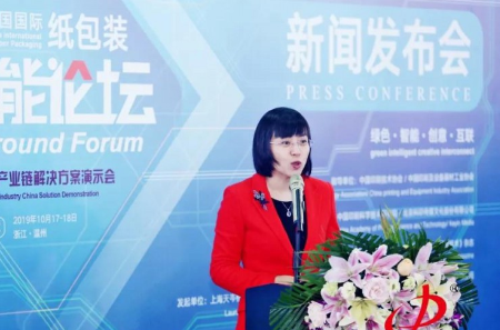 其后,常晓霞女士代表主办单位发言。她首先对往届活动进行了简单回顾。CIPP自2015年创立,每两年举办一届,至今已成功举办两届,在业内建立了不小的影响力。CIPP2015于2015年11月在上海(上海天岑工厂)隆重召开,作为首届活动,可谓盛况空前,仅仅不到两个月的筹备时间,共计500余人前来参加。CIPP2017则在2017年10月移师浙江温州(浙江劲豹工厂),在这片充满活力和热情的印机制造热土上,再次绽放精彩,不仅参与企业由第一届的8家扩大至20余家,演示会当日的交易额更是比第一届翻了一番,全产业链平台的价值正在得到很好的体现。随后,她还向与会来宾介绍了CIPP2019的基本情况。CIPP2019将于2019年10月17——18日在浙江温州(浙江正润新工厂)盛大举行,本届论坛将以“绿色•智能•创意•互联”为主题,继续以“高端论坛+纸包装全产业链解决方案现场演示+现场交易”的创新形式展开;同时向纸包装全产业链广泛邀约,呼吁具有创新意识、前瞻意识的产业链代表积极参与,共同搭建创新平台。