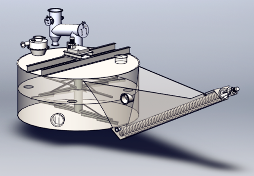 石灰从消化器上部进入,与绿液经旋流喂料器混合后进入筒体,在搅拌装置的搅拌作用下,使石灰充分地被消化,形成石灰乳液,石灰乳液经筒体下部的乳液出口进入提渣机槽体底部,石灰乳液中未被消化的石灰渣经螺旋叶片输送到上部,使之与乳液分离,洗涤后由出渣口排出,石灰乳液溢流到苛化器。