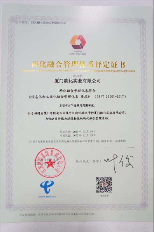 近日,我司获证“两化融合管理体系”评定,兹以证明我司两化融合管理体系符合《信息化和工业化融合管理体系要求》。