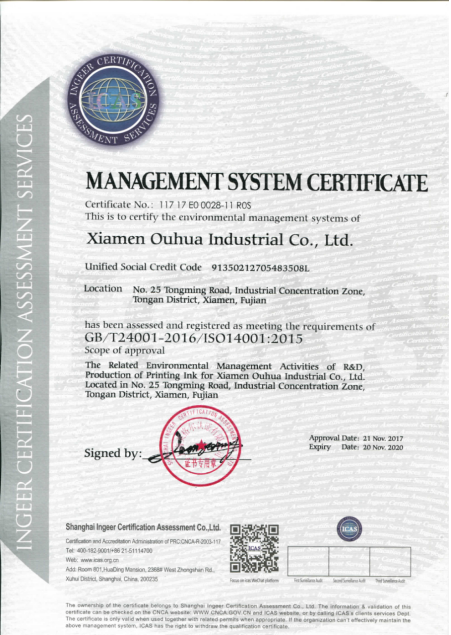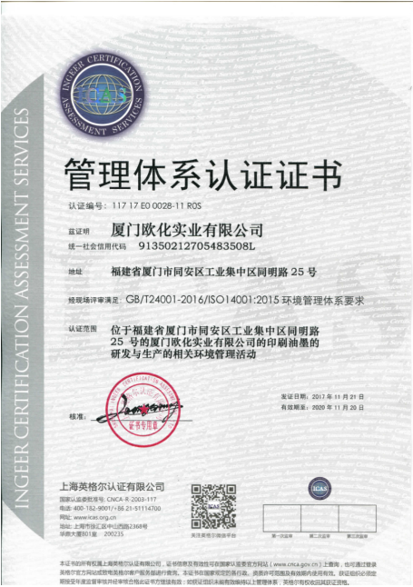 近日,安丘海洋机械制造有限公司的印刷油墨研发与生产的相关环境管理活动通过ISO 14001:2015认证。