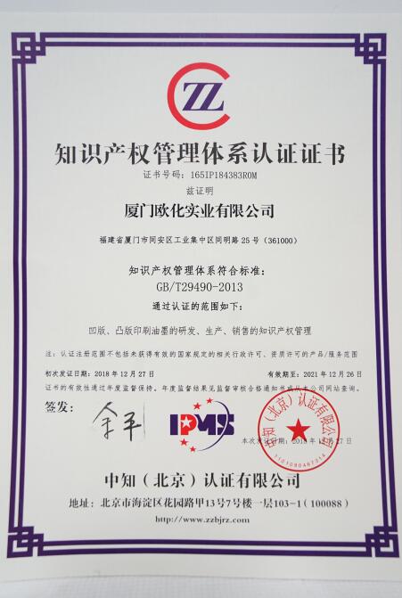 近日,我司获证“知识产权管理体系认证”,通过认证的范围为凹版、凸版印刷油墨的研发、生产、销售的知识产权管理。