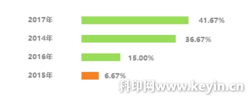 自2013年首届印刷电商年会以来,国内涌现了越来越多的印刷电商。根据调研结果,加入印刷电商的印刷企业数量也在逐年增加,尤其在2017年,实践者数量集中增长。
