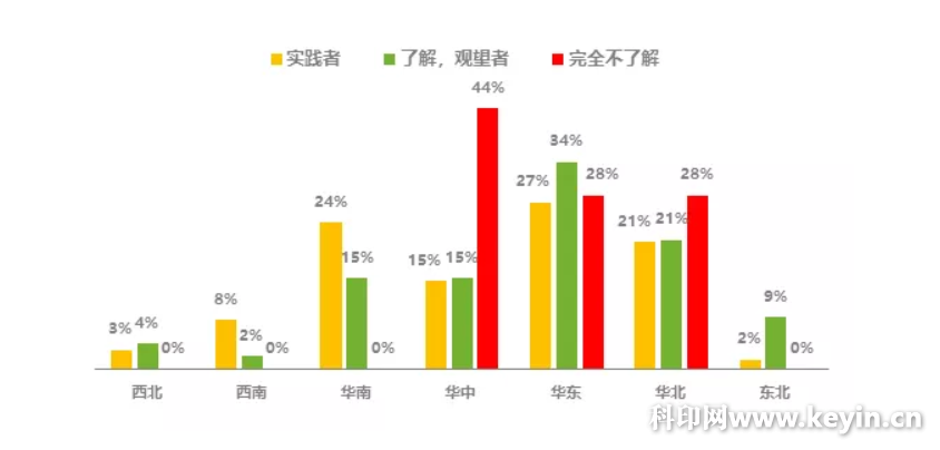 华东地区对印刷电商的认知度最高,且实践者人数最多;华中地区对印刷电商的认知度最低;与去年相比在我们调研的目标人群中,东北地区已经开始有实践者;其余各地区对印刷电商的认知分布相对平均。