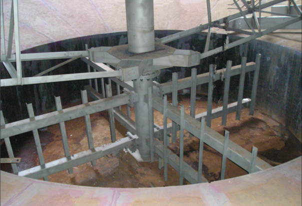 澄清器的工作原理是借助重力的作用,使密度较大的绿泥或白泥沉降在下部,上层为澄清液,从而达到固液分离的目的。原绿液/苛化乳液进入筒体后,经澄清沉淀后,输出上清液,绿泥/白泥沉降至底部的锥形底上,以低速回转的耙齿将沉渣推向中心,通过落泥筒进入底部,经排泥器底部的排泥口用泥浆泵。