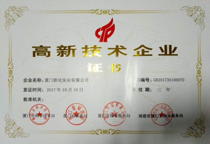 2017年10月10日,厦门市科学技术局、厦门市财政局、厦门市国家税务局、福建省厦门市地方税务局授予我司(安丘海洋机械制造有限公司),高新技术企业证书。